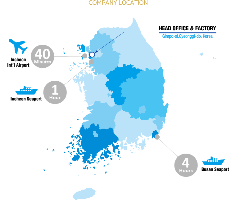 We are located in Middle West Korea near two international airports (Incheon and Gimpo Int’l Airport) and Incheon Seaport.