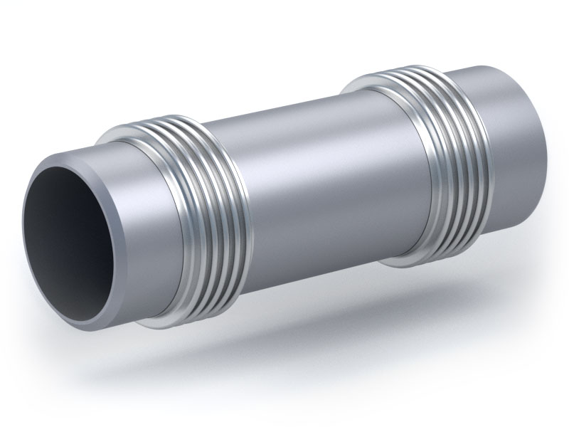 This expansion joint has two bellows sections connected by a center pipe section. This design allows for large amounts of lateral deflection. The universal can also allow for axial and angular movements in addition to the lateral movement. This expansion joint does not come with the hardware to resist pressure thrust. Like the single unrestrained expansion joint the universal expansion joint must be properly anchored and supported.Features