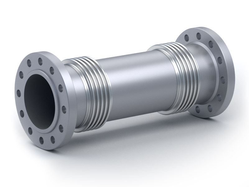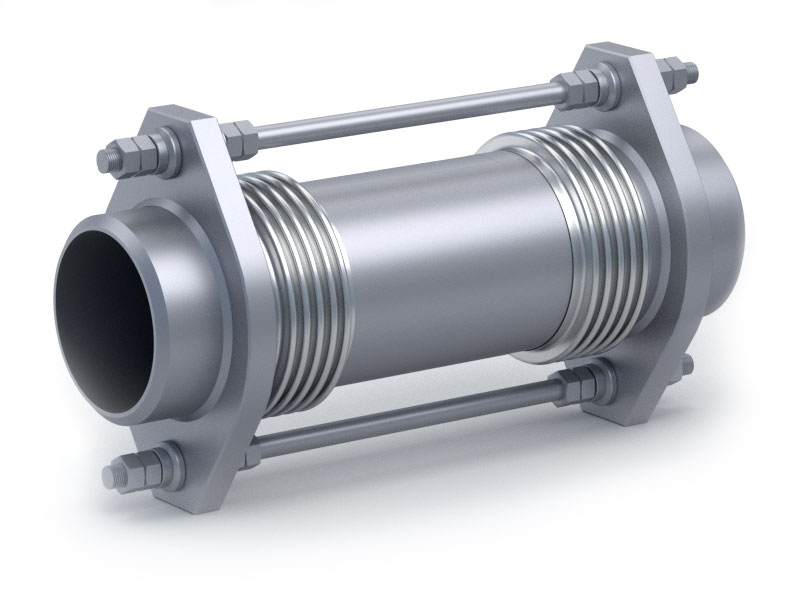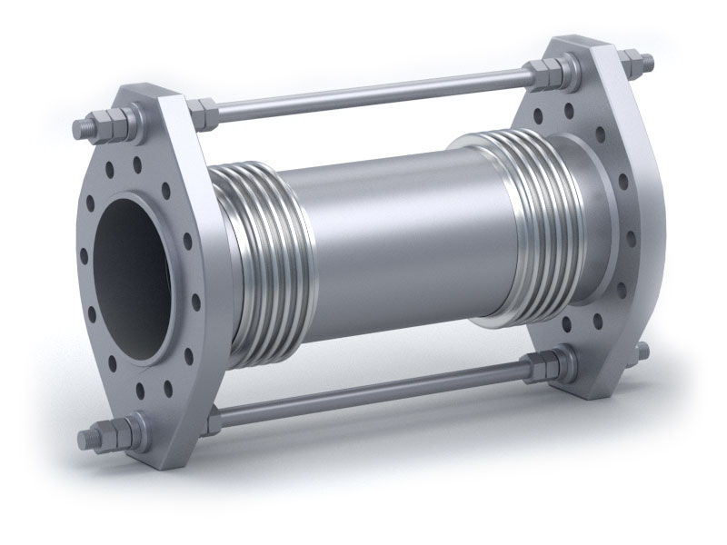 Universal tied expansion joints contain two bellows separated by a pipe spool with tie rods designed to withstand the pressure thrust force. These expansion joints are generally designed to accommodate lateral movement only. A universal expansion joint can be designed to have a very low lateral spring force to minimize forces on adjacent equipment. Large offset movements are possible in a universal assembly by increasing the distance between the two bellows. A two tie rod design can also accept angular deflection in a single plane.Features